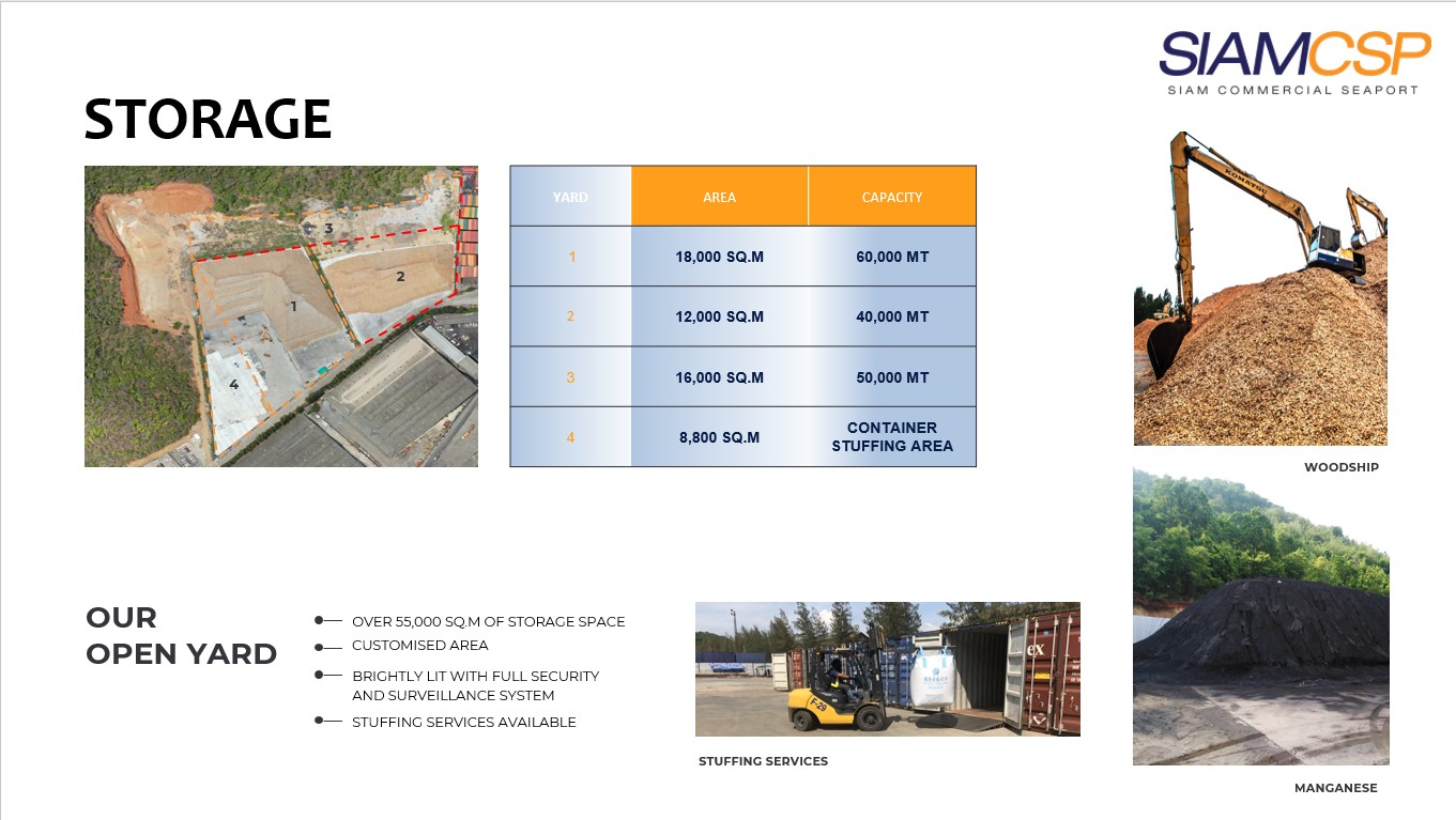 SIAMCSP also provide a full range of facilities and services in 4 open yards in total of 100,000 square metres with capacity of 2,000,000 tons per year for storage of bulk cargo such as wood chip, plam shell, steel pipe and construction machine. Our open yard is monitored by on-site CCTV system and security team for 24 hours.